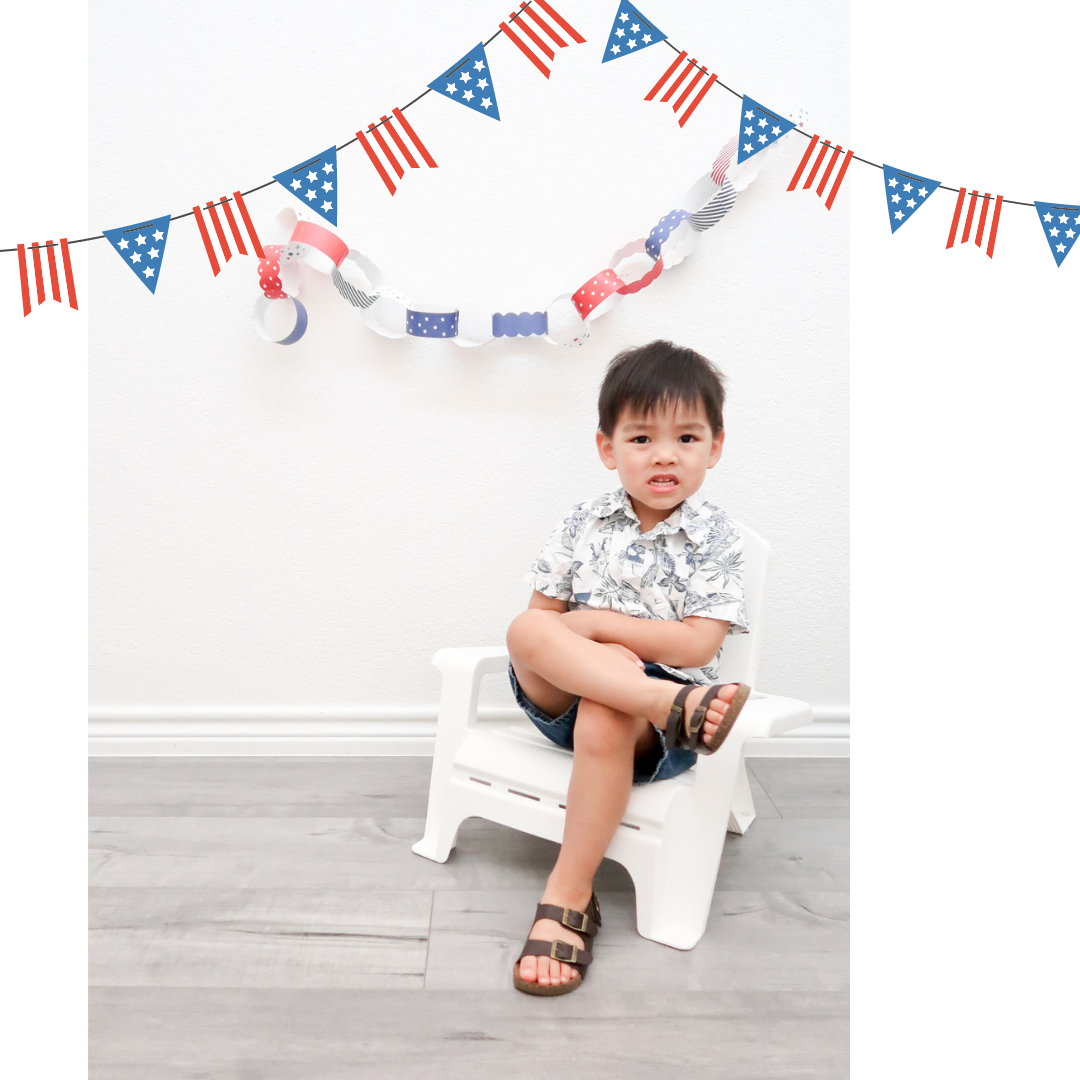 Our family loves a Hawaiian shirt theme for summer events. I was so happy when I found this tropical print smocked dress and Hawaiian shirt at Once Upon A Child. I was able to score the dress for $6.50 and the shirt for $4.50. Coincidentally, my husband already owns a blue Hawaiian shirt that we found at our local thrift store. We wore these outfits for Father’s Day, but we just might have to wear them again for Independence Day. The colors and casual summer vibes fit both holidays so perfectly. To enhance the 4th of July look, I snapped some quick photos of my kids with this patriotic DIY chain link garland.